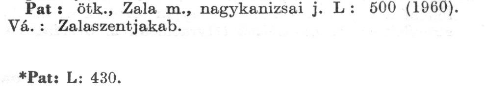 Nyilvános 2486 | 5696 | A szócikkek felismertetett szövege: | (A csillag után az 1972-es kiadású kiegészítő kötetből származó szöveg következik) Pat: ötk., Zala m., nagykanizsai j. L : 500 (1960). Vá.: Zalaszentjakab. *Pat: L: 430. A szócikkek a következő lexikonból származnak: Cím: Új magyar lexikon Közreműködő: Berei Andor (1900-1979) (szerk.) Szerz. közl.: [szerk. Berei Andor et al.] Kiadás jelzés: 2. lny. Kiadás: Budapest : Akad. K., 1961-1962 Kötetei: 1., A - C 2., D - F 3., G - J 4., K - Me 5., Mf - R 6., S - Z 7. köt., A-Z Kiegészítő kötet (1972) Kiegészítő kötet, 1962÷1980 (1981) ETO jelzet: 03=945.11 Szakjelzet: 030 Cutter: U 28 Nyelv: magyar Megjegyzés: Bibliogr. a címszavak egy részének végén |