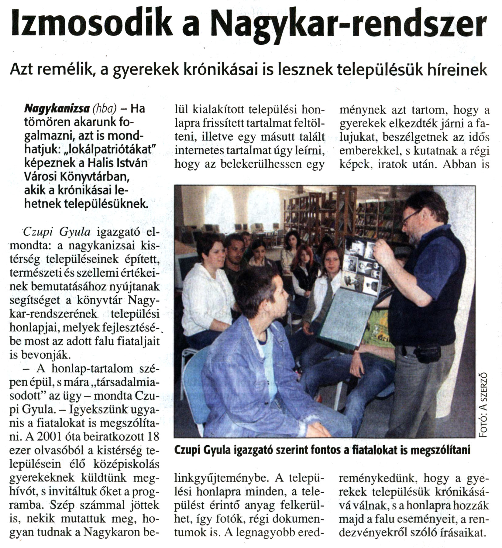 Nyilvános 14393 | 28723 | Zalai Hírlap 2008. június 9. 133. szám 12. oldal - Izmosodik a Nagykar-rendszer | A cikk szövege: Izmosodik a Nagykar-rendszer Azt remélik, a gyerekek krónikásai is lesznek településük híreinek Nagykanizsa (hba) - Ha tömören akarunk fogalmazni, azt is mondhatjuk: „lokálpatriótákat" képeznek a Halis István Városi Könyvtárban, akik a krónikásai lehetnek településüknek. Czupi Gyula igazgató elmondta: a nagykanizsai kistérség településeinek épített, természeti és szellemi értékeinek bemutatásához nyújtanak segítséget a könyvtár Nagykar-rendszerének települési honlapjai, melyek fejlesztésébe most az adott falu fiataljait is bevonják. - A honlap-tartalom szépen épül, s mára „társadalmiasodott" az ügy - mondta Czupi Gyula. - Igyekszünk ugyanis a fiatalokat is megszólítani. A 2001 óta beiratkozott 18 ezer olvasóból a kistérség településein élő középiskolás gyerekeknek küldtünk meghívót, s invitáltuk őket a programba. Szép számmal jöttek is, nekik mutattuk meg, hogyan tudnak a Nagykaron belül kialakított települési honlapra frissített tartalmat feltölteni, illetve egy másutt talált internetes tartalmat úgy leírni, hogy az belekerülhessen egy linkgyűjteménybe. A települési honlapra minden, a települést érintő anyag felkerülhet, így fotók, régi dokumentumok is. A legnagyobb eredménynek azt tartom, hogy a gyerekek elkezdték járni a falujukat, beszélgetnek az idős emberekkel, s kutatnak a régi képek, iratok után. Abban is reménykedünk, hogy a gyerekek településük krónikásává válnak, s a honlapra hozzák majd a falu eseményeit, a rendezvényekről szóló írásaikat. Képaláírás: Czupi Gyula igazgató szerint fontos a fiatalokat is megszólítani |